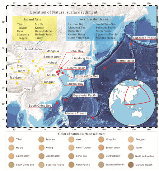 Locations and colors of natural samples (surface sediments from Inland Asia and the Western Pacific Ocean).