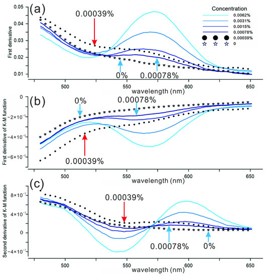 Previous studies indicate that the DRS detection limit of hematite can reach 0.01% (for the first derivative processing) and 0.1% (for the first and second derivatives of the K–M function) [32]. However, it is unknown whether the DRS technique can detect hematite with a lower concentration, which is of great significance for the application range (region) of hematite information. To explore the potential limit of DRS for hematite detection, we designed continuous sample sequences with ultralow concentrations (as low as 0.00039%). In addition, samples were scanned with more precise steps (0.5 nm), and then more detailed spectral information could be detected for hematite. Our results suggest that the DRS method has the potential to detect a much lower concentration of hematite, as low as 0.00078% (Figure 4), which is at least two orders of magnitude smaller than the previous result (e.g., 0.1% and 0.01%).