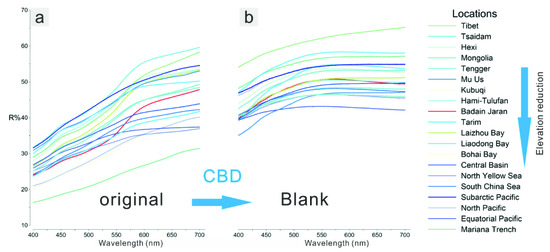 Thus, we used the CBD method to dissolve hematite and facilitate the comparison of DRS before and after the CBD process. Results show that the characteristic signals of hematite in the original DRS curve (Figure 5a) are highly attenuated after the CBD processing for all samples (Figure 5b).