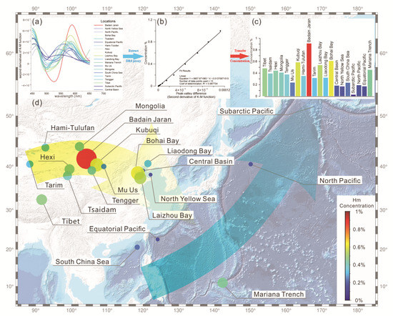 Estimated hematite concentration of natural samples (color and size of the circle both reflect the concentration of hematite). (a) The second derivative of the K–M function processing natural DRS curves. (b) Correlation between concentration and DRS proxy (referring to Section 3.2). (c) Statistical results of estimated hematite concentration for natural samples. (d) Location and estimated hematite concentration for natural samples (variations of concentration are indicated by the color bar).