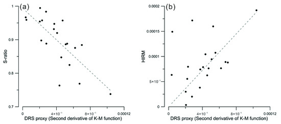 Comparison between DRS and magnetic methods in detecting natural samples. (a) S-ratio versus DRS and (b) HIRM versus DRS.