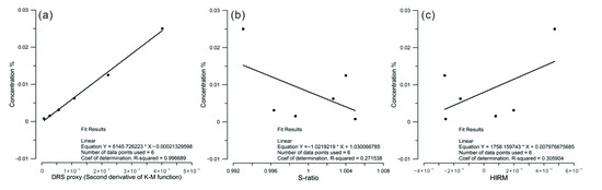 To quantify the characteristic reflection more effectively, raw reflectance curves were processed with different methods. Distinctive signatures of hematite are manifested after different procedures. The signature (proxy) of hematite in the first derivative curve is represented by a peak at 500–600 nm, the value of which increases systematically with increasing hematite concentration. However, a clear overlap exists after reaching a certain height (Figure 3b). In contrast, the signature (proxy) of hematite in the first derivative of the K–M function curve is manifested as a valley at 500–600 nm, which is more obvious as the hematite concentration increases (Figure 3c). For the second derivative of the K–M function, the signature (proxy) of hematite is characterized by a valley and a following peak at a longer wavelength at 500–600 nm. As hematite concentration increases, amplitudes between the peak and valley increase synchronously and show a symmetrical tendency (Figure 3d).