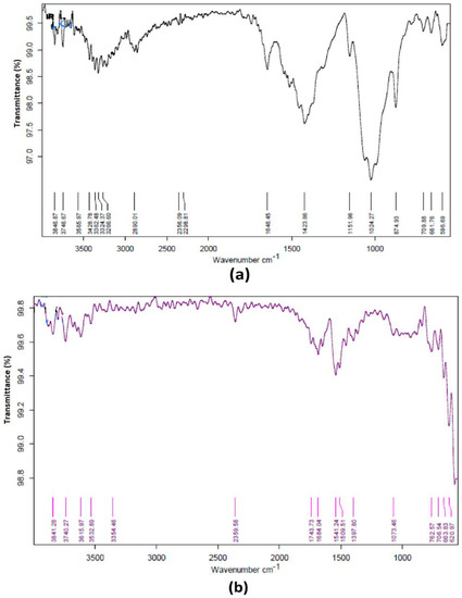 The metal–oxygen (Fe–O) bond in Fe–CTB (Figure 2b) was observed at 620.97 cm−1 along with a decreased intensity of other peaks, referring to the functional groups involved in bonding with Fe(III), and hence, the formation of Fe–CTB was confirmed [26,27].