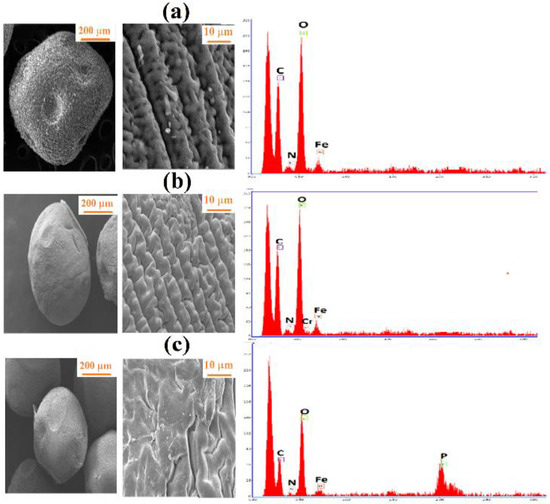 (a) SEM images at different resolutions and EDX spectra of (a) Fe–CTB microbeads (b) after Cr(VI) adsorption and (c) after phosphate adsorption.