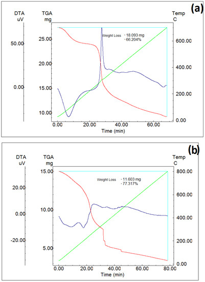 The FTIR analysis of beads was carried out using a Bruker Alpha, London, UK, spectrometer in the range of 500–4000 cm−1. SEM analysis was carried out using the Tescan Vega 3 SBH model. X-ray diffractograms were recorded using a Rigaku MiniFlex 300, Tokyo, Japan instrument, while TGA–DTA studies were conducted using a DTG-60 (Shimadzu, Kyoto, Japan) thermal analyzer in nitrogen atmosphere at a 100 mL min−1 flow rate. BET analysis was performed using the Quantachrome NOVA 2200e model, which was based on nitrogen adsorption–desorption curves to give surface area and pore properties.