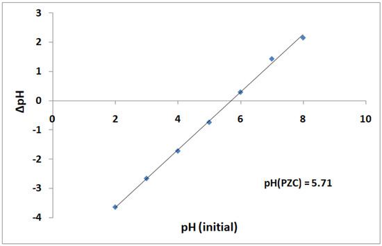The pH point of zero charge (pHPZC) of Fe–CTB was found to be 5.7 by batch equilibrium technique [28]. Amounts of 50 mL of 0.1 M NaCl solutions with 100 mg of Fe–CTB were taken in conical flasks with a varying pH at 2.0–9.0, stirred for 24 h. The solutions were filtered, and the final pH of each system was measured. A graph was plotted between ∆pH (pHinitial-pHfinal) and pHinitial, whose x-intercept gives pHPZC (Figure 5), indicating that the surface charge of Fe–CTB is positive below pH 5.71 and negative above it.