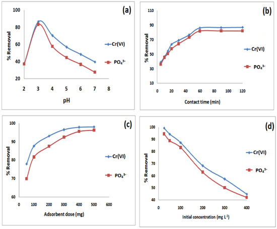 (a) Effect of initial solution pH, (b) effect of contact time, (c) effect of adsorbent dose, and (d) effect of initial concentration on the adsorption efficiency of Fe–CTB towards Cr(VI) and PO43−.