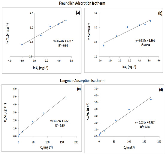 An adsorption isotherm study is an appropriate tool to evaluate adsorbents’ performance quantitatively. Additionally, it gives information about the adsorption ability and surficial properties and affinity of a prepared adsorbent [29]. The Langmuir [30] and Freundlich [31] adsorption isotherms were applied to study the adsorption nature of Cr(VI) and phosphate ion individually on an Fe–CTB composite (Figure 7). The linearized equations for these two isotherms are given by: