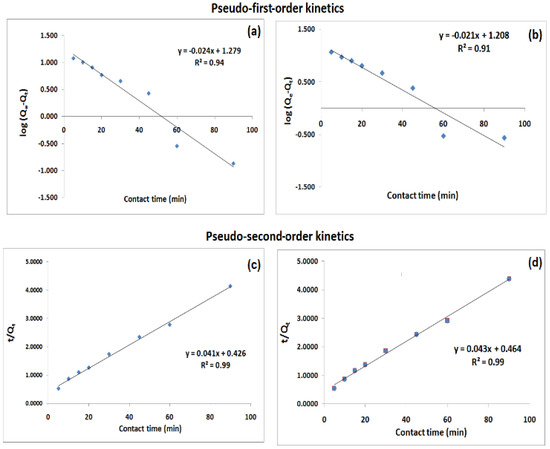 Pseudo-first-order and pseudo-second-order models were studied to understand the adsorption process kinetics [33,34]. The best-fit kinetic model was elected based on both the linear coefficient of determination (R2) and the calculated qe values.