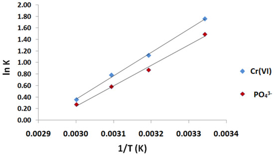Thermodynamic parameters are useful in establishing the energetics involved in the adsorption process. Adsorption efficiencies were established at different temperatures varying from 298 to 333 K. Gibbs free energy change was obtained from the equilibrium constant, while enthalpy and entropy changes were obtained using the intercept and slope of the van’t Hoff curve (Figure 9). These values are depicted in Table 3. Data of both Cr(VI) & PO43− ions indicate negative Gibbs free energy change (∆G), depicting the spontaneous adsorption behavior that becomes less favorable at a higher temperature. Negative enthalpy change (∆H) shows an exothermic nature, while negative entropy change (∆S) clearly indicates a decrease in disorder during the Cr(VI) and phosphate adsorption onto the Fe–CTB surface.