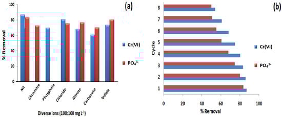 The presence of other co-ions, such as chloride, nitrate, carbonate, and sulfate, which are typically present in targeted contaminated wastewater, gives a negative influence and competes with chromate and phosphate ions for available adsorption sites, hence decreasing the removal efficiency of the prepared Fe–CTB [35]. Thus, it is usual to observe the interference of these diverse ions on removal efficiency in binary solutions. A 100 mg L−1 chromium and phosphate solution was mixed with a 100 mg L−1 solution of the interfering ion, and the effect of adsorption efficiency was evaluated. It was observed that the existence of co-ions disturbs Cr(VI) and phosphate ion removal capacity (Figure 10a). The competition among the coexisting anions to grab the active surface sites of the adsorbent depends on the concentration, dimension, and charge on the anions [36]. In the present study, CO32− had the largest effect on Cr(VI) and phosphate ion adsorption in separate systems, followed by nitrate, phosphate, chloride, and sulfate ions.