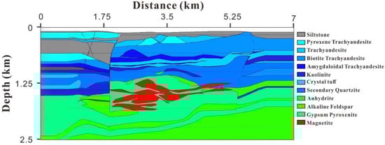 A complex ore-hosting velocity model which is modified from a geological model in the Luzong Basin, China (Sun et al., 2015 [14]).