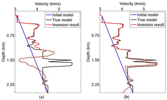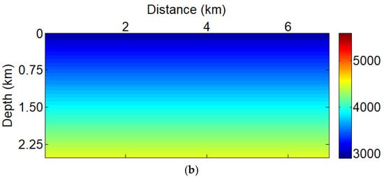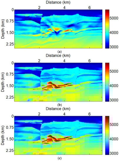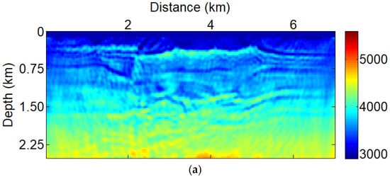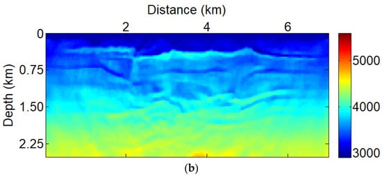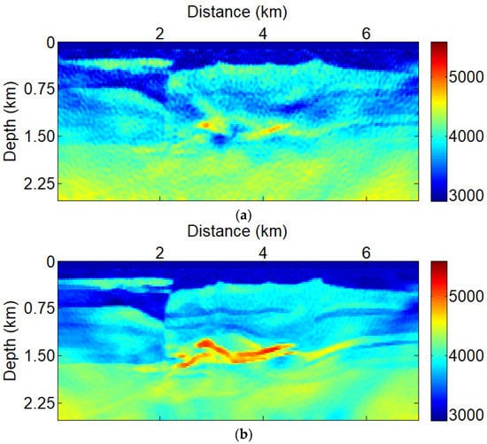 In the TV-PAFWI misfit, the coefficient balances the confidence level between the data misfit function and the regularization term. Therefore, an appropriate regularization coefficient () is important to constrain the model inversion. In this case, a simple TV parameter selection procedure is applied to test the PAFWI methods. For example, in Figure 8, we set and , respectively. Figure 8a shows that the TV-PAFWI is strongly affected by the phase artifacts, when amplitude factor p = 0 and . This is because the PAFWI misfit function has great potential for enhancing deep reflections and introducing imaging artifacts. The comparison results of Figure 7b and Figure 8a show that the TV-PAFWI with amplitude factor p = 0 and results are more similar to the true velocity value. The phase artifacts have been successfully suppressed in the inversion process. Therefore, the combination of total-variation regularization and PAFWI misfit function can resist imaging artifacts caused by the amplitude attenuation. It can effectively recover the ore bodies, especially in the deep part.