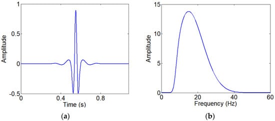 Seismic source function; (a) A low-cut 6 Hz Ricker wavelet; (b) The spectrum of the low-cut Ricker wavelet.