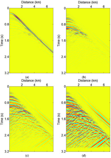 To explain the characteristic of the time–frequency phase and amplitude information, in Figure 4, we show the adjoint sources with different amplitude factors in the time–space domain. In Figure 4a, we see the PAFWI adjoint source with amplitude factor p = 1, which is similar to the adjoint source of traditional FWI. The amplitude factor in the PAFWI misfit function was then gradually decreased to reduce the amplitude constraints. Comparisons in Figure 4a–c demonstrate that the PAFWI adjoint sources with p = 0.6 and p = 0.3 show clear reflection signals, especially for the deep parts. However, when the PAFWI amplitude factor is set to p = 0, it is a pure phase misfit function which contains too much phase artifacts, leading to an unstable inversion algorithm. Therefore, the amplitude information is also significant for the seismic waveform inversion. In this case, to fully use the linear characteristics of the phase information while avoiding the problems of algorithm instability and gradient imbalance, the PAFWI amplitude factor should be set between 0.3 and 0.6.