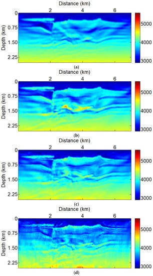 TV-PAFWI + FWI with high frequency data (6–20 Hz), using the models shown in Figure 5a–d as the initial models with amplitude factors are (a) p = 1, which is the TV-FWI method; (b) p = 0.6; (c) p = 0.3; (d) p = 0.