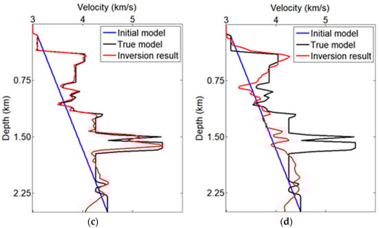 Then, the TV-PAFWI results with low-frequency seismic data are regarded as an initial velocity model to improve the resolution of the ore bodies, as shown in Figure 6. Comparison of Figure 6a–d shows that the TV-PAFWI with p = 0.3–0.6 can better recover the ore bodies. In comparison of Figure 6a with Figure 6b, we see that the quality and resolution of the ore bodies have been greatly improved, and the deep structures can be seen clearly. The velocity profiles with different methods are shown in Figure 7. The velocity comparisons show that the TV-PAFWI with p = 0.3–0.6 can obtain inversion results. Therefore, in this case, the amplitude factor was chosen as p = 0.3–0.6 for the ore-hosting velocity model inversion.