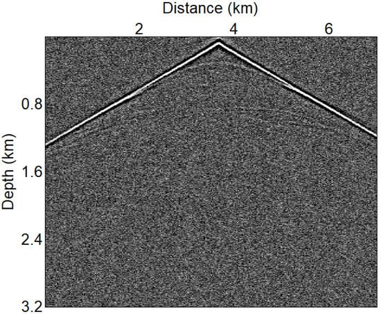 The previous test shows that strong phase artifacts may contaminate the PAFWI with small amplitude factors. Therefore, we added the total variation regularization to form a TV-PAFWI method to solve this problem. In this section, we added the commonly used Gaussian noise into the synthetic seismic data. Figure 9 shows one shot seismic data with strong Gaussian noise (SNR = −4.31 dB). In this case, the reflected signals are almost submerged in the noises, which makes it difficult for FWI to retrieve the subsurface structures and therefore produces incorrect inversion results.