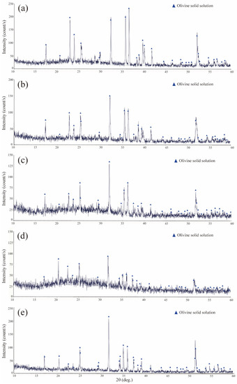 Powder X-ray diffraction patterns of synthesized olivine solid solutions: (a) Fo100-3, (b) Fo75Fa25-8, (c) Fo50Fa50-4, (d) Fo25Fa75-4, and (e) Fa100-6.