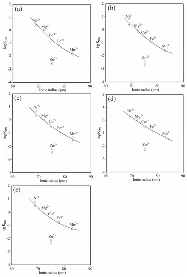 Table 2 shows the logarithmic values of the distribution coefficients obtained from Equation (4) using the ratio of each endmember component in the olivine solid solutions and the molality of the neutral aqueous species obtained in Section 4.1. Figure 3 shows the diagram of the logarithmic distribution coefficient vs. ionic radius (PC–IR). The ionic radii in the sixfold coordinated site reported by Shannon and Prewitt [24] were used in the construction of the diagrams.