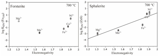 Logarithmic distribution coefficient (log KDN) vs. electronegativity (Pauling) diagrams for olivine (Fo100) and sphalerite, except for Zn2+. Electronegativity data were taken from Emsley [26]. Distribution coefficient values for sphalerite were taken from Uchida et al. [16].