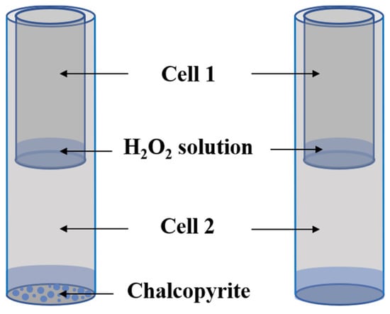 The microcalorimetric measurements were accomplished with a RD496–2000-type microcalorimeter (Mianyang CP Thermal Analysis Instrument Co, Ltd., Mianyang, China). H2O2 solution and pure water were adjusted to pH 8 using NaOH. Then, 1 mL H2O2 solution and 0.1 g chalcopyrite sample together with 1 mL pure water were injected into a sample cell 1 (3 mL) and sample cell 2 (6 mL), respectively (Figure 1). Once the sample cells reached an isothermal condition at a stable baseline, cell 1 was pierced and H2O2 solution was flowed into cell 2. The thermal effect was then automatically recorded.