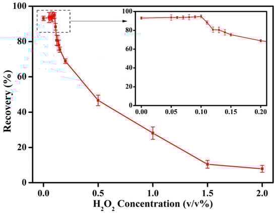 Figure 2 shows the flotation recoveries of untreated and H2O2-treated chalcopyrite. Untreated chalcopyrite displayed a good flotation performance with a recovery of 93.1%, which was increased to 94.8% in the presence of 0.1% H2O2. However, the recovery decreased dramatically with increasing H2O2 concentration, achieving a recovery of about 7.93% at 2 v/v % H2O2.