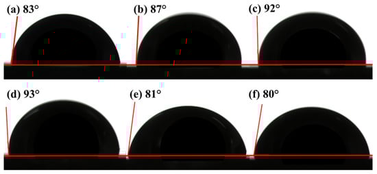 Contact angles of (a) untreated chalcopyrite and treated chalcopyrite with (b) 0.06% H2O2, (c) 0.08% H2O2, (d) 0.1% H2O2, (e) 0.12% H2O2, and (f) 0.14% H2O2 in pure water at pH 8, with 200 g/t butyl xanthate.
