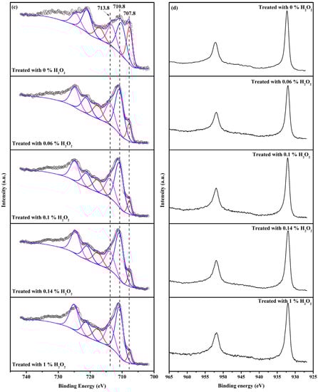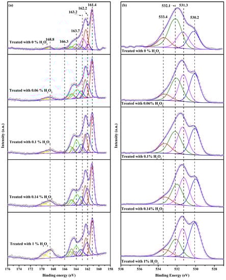 Figure 4a shows the high-resolution S 2p spectra collected from chalcopyrite treated without and with H2O2 at a concentration of 0.06, 0.1, 0.14 and 1 vol.% (v/v) at pH 8 in the absence of xanthate. The binding energy (BE) at 161.4 eV is attributed to S2− species [20,21] while the S 2p3/2 peaks located at 162.2 and 163.2–163.7 eV match the S22− and Sn2−/S0 species, respectively [3,14,22]. The peaks at 166.3 and 168.8 eV belong to the species of SO32− and SO42− [14,23], which increased as the oxidation process proceeded. The BE at 165.1 eV is assigned to an energy loss feature (S 3p → Fe 3d) [24,25].