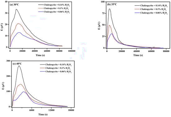 When chalcopyrite was treated with 0.14 vol.% H2O2, peak intensity increased significantly and shifted to the left at 30 °C (Figure 5a), indicating that a higher concentration of H2O2 facilitated the oxidation between chalcopyrite and H2O2, i.e., an easier oxidation may occur on the chalcopyrite surface. In addition, the oxidation reaction time was significantly shortened as the temperature rose, i.e., from about 80,000 s at 30 °C to less than 20,000 s at 40 °C, indicating that a higher temperature increased oxidation rate. Moreover, the maximum thermoelectric potential increased with the increment of temperature, suggesting a more violent reaction at a higher temperature.