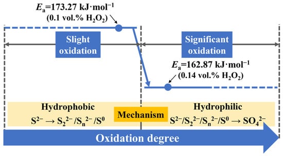 Therefore, when the H2O2 concentration is lower than 0.1 vol.%, the slight oxidation mechanism dominates with the main reaction process being the oxidation and dissolution of Fe, forming F–O/OH and Fe-SO species on the chalcopyrite surface. In addition, the surface S is readily oxidized to form S22− and Sn2−/S0. However, when H2O2 concentration is greater than 0.14 vol.%, the significant oxidation mechanism dominates with the main reaction process being the oxidation of surface S to form SO42−. It should be noted that within the scope of the oxidation degree covered herein, Cu remains univalent and non-oxidized. The schematic diagram of the mechanisms of the oxidation process is shown in Figure 6.
