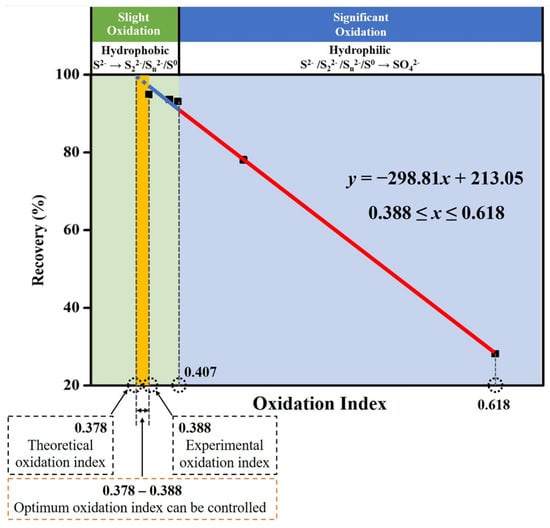 A good linear fitting was found between flotation recovery and oxidation index, as shown in Figure 8, i.e., a fitted curve of y = −298.81x + 213.05 (y and x represent the recovery and oxidation index, respectively, 0.388 ≤ x ≤ 0.618), with an R2 of 0.9972. According to the curve, it can be estimated that when the theoretical recovery was 100%, the corresponding oxidation index was 0.378. Therefore, the oxidation index corresponding to the optimal oxidation point should be ranging from 0.378 to 388. It should also be noted that chalcopyrite flotation recovery is positively related to the adsorption density of SBX on the chalcopyrite surface. In other words, the highest chalcopyrite flotation recovery (the optimal oxidation points ranging from 0.378 to 0.388) can be regarded as the highest SBX adsorption on chalcopyrite surface, although the actual adsorption density is not measured herein. However, further oxidation on chalcopyrite due to higher H2O2 concentration is negative to the adsorption of SBX on chalcopyrite, thereby decreasing chalcopyrite flotation.