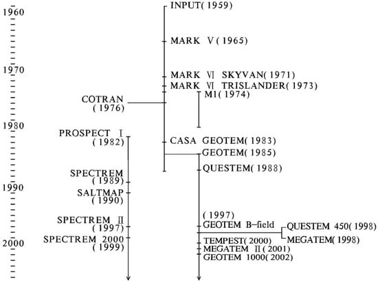 The fixed-wing time-domain airborne electromagnetic method (FTEM) is a geophysical exploration technique [1] which is based on fixed-wing aircraft and equipped with time-domain electromagnetic exploration equipment. INPUT (Induced Pulse Transient) was first introduced in 1959; it was the first time-domain airborne EM system which used semi-sinusoid waves with positive and reverse alternations as transmitter currents and measured the secondary field during the off-time [2,3]. This type of system can be called a pulse system. Few people appreciated the full impact that this development would have on the future of FTEM at that time [3], and in the 50 years after its first introduction, more than 20 FTEM systems (Figure 1) have been developed worldwide, such as QUESTEM, SALTMAP, TEMPEST, SPECTREM, GEOTEM, and MEGTEM [2,3,4,5,6,7,8,9,10,11,12,13,14,15]. These FTEM systems were gradually improved and developed on the basis of the INPUT system or inspired or influenced by its technical principles. They all inherited technical characteristics, except for the SPECTREM system and SALTMAP system.