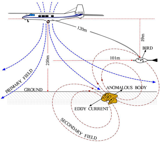 iFTEM-I is a time-domain towed-bird transient electromagnetic system, and its working status is shown in Figure 2. The iFTEM-I system is mounted on a Y12-IV aircraft, and the transmitter loop is wound around wing tips, the nose, and the tail of the aircraft. A pulse signal with a certain waveform transmitting through the transmitter coil generates the primary field around it (on-time). Under the excitation of the primary field, the underground anomalous body is induced to produce an induced current, namely an eddy current or secondary current. The eddy current generates the secondary field around the body. Due to the passive excitation of the secondary field and the thermal loss of the induced current inside the body, the secondary field will gradually decay. The receiver bird receives the secondary field signal the whole time. Then, the electrical distribution structure and spatial form of the underground body can be inferred by analyzing the secondary field (off-time) [31].