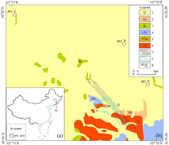 Binxian is located in the eastern part of Harbin of Heilongjiang province, about 60 km away from Harbin Pingfang airport. There are four survey lines in the survey area; the line spacing is 250 m, and the line direction is 138.9°. It can be seen from Figure 5 that the north-west (NW) parts of the survey lines are Quaternary, the middle parts are mainly reservoir, and the south-east (SE) parts are low-hilly mountains with exposed Yanshan granite. There are no drills or ores, but three hydrogeological drills are located not far from the survey area. The depths of the three hydrogeological drills are from 157 m to 204 m (Figure 6 displays the stratigraphic section of the B21 drill). The data from the drills show that the shallow surface is made up of Quaternary clay and loam with a thickness less than 30 m, and the depths below are made up of Cretaceous sandstone and mudstone. In general, the resistivity of clay, loam, sandstone, and mudstone is lower, while the resistivity of granite is higher.