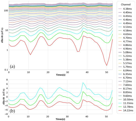 The peak-to-peak statistical method was adopted to select the last three late channels’ data after being preprocessed (Figure 7). The maximum difference calculated between the maximum peak value and the minimum peak value was taken as the noise level of the data. In this way, the noise level of iFTEM-I, flown in Binxian, was 13 nT/s, which was the noise level of the last three late channels’ data (Figure 7b) after de-noising and correction pretreatment was applied to the measurement data of the high–altitude background field (Figure 7a).