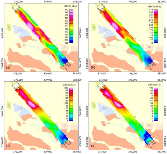 Contour map of dBz/dt of 4 different sampling channels. (a) CH1; (b) CH5; (c) CH10; (d) CH15.