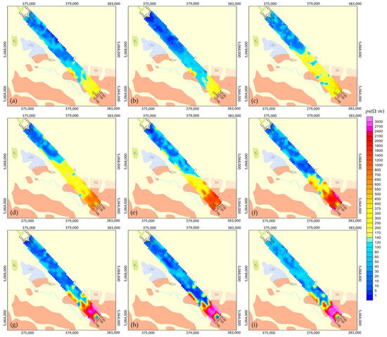 Resistivity plane contour map at different depths: (a) −20 m; (b) −60 m; (c) −100 m; (d) −150 m; (e) −200 m; (f) −250 m; (g) −300 m; (h) −350 m; (i) −400 m.