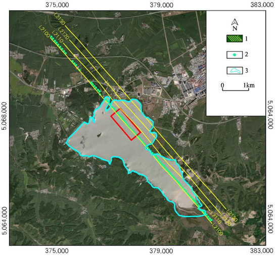 Ground TEM survey diagram. 1—flown footprint, 2—ground TEM survey position, 3—reservoir.