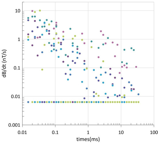 The transmitter was turned off, and data continued to be collected during the ground TEM measurement. The result of this measurement was the noise of the system in the measurement area. In this way, the noise level maximum was 10 nT/s in early sampling channels and below 2 nT/s in middle and late sampling channels, as shown in Figure 11.