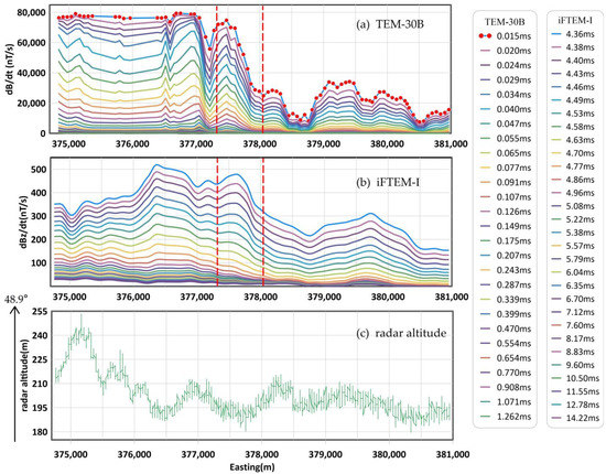 Comparison of profile response of L2100 between iFTEM and TEM-30B. (a) Profile response of TEM-30B (27 channels ahead); (b) profile response of iFTEM; (c) radar altitude of iFTEM. Between the red dash lines are the red rectangle areas from Figure 10.