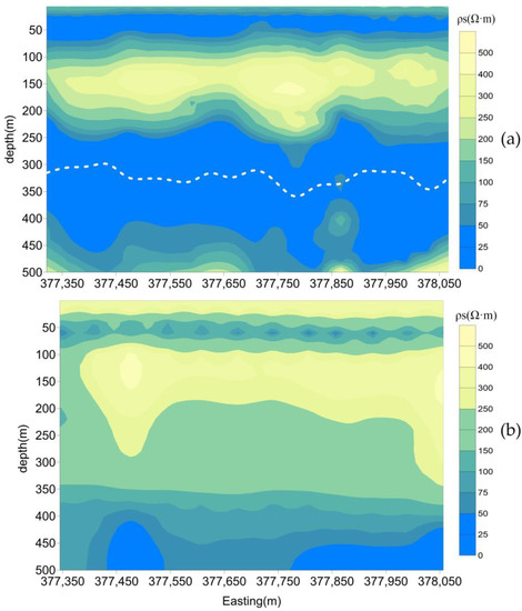Comparison of inversion resistivity depth diagram between (a) iFTEM-I and (b) TEM-30B. The white dash line is the max depth of investigation according to Formula (2) and the peak-to-peak noise level (13 nT/s) in (a), not drawn in (b) because the maximum depth is deeper, and most are out of range.