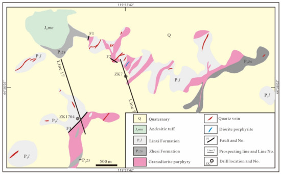The strata in this ore district consist of the Zhesi Formation, the Linxi Formation, and the Manitu Formation (Figure 2). The Manitu Formation unconformably overlies the Zhesi Formation in the ore district and is composed of andesitic breccia clastic tuff, andesite, and dacite. The Linxi Formation consists of silty slate, sandy slate, and metamorphic fine sandstone. The Zhesi Formation consists of silty slate interbedded with a less argillaceous slate.