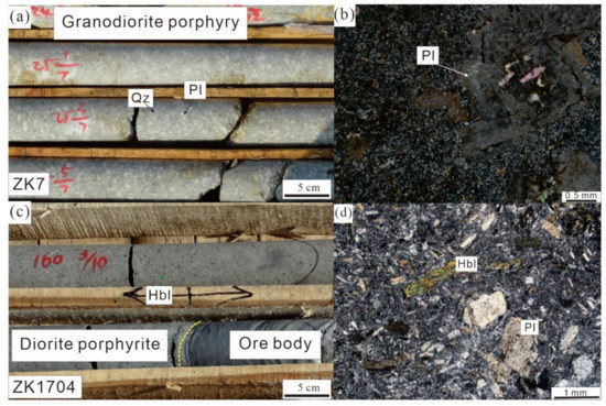 The diorite porphyrite was selected (ZK1704) for LA-ICP-MS zircon U-Pb dating and Hf isotopic analyses, and two samples (ZK1704-1 and ZK1704-2) without alterations for whole-rock geochemistry of diorite porphyrite, which obviously destroyed the integrity of the ore bodies, were selected from the ZK1704 drill core (Figure 3b). The diorite porphyrite has porphyritic texture and massive structure (Figure 4c,d), and the phenocryst minerals are dominated by plagioclase (15%–20%), alkali feldspar (5%–10%), and amphibole (<5%); the matrix minerals are composed of the plagioclase, alkali feldspar, quartz, amphibole, and biotite.