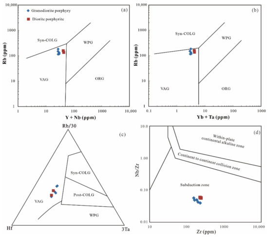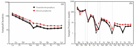 On the rare earth element (REE) chondrite-normalized spider diagram (Figure 6a), the granodiorite porphyry and diorite porphyrite rocks are characterized by the significant enrichment of light rare earth elements (LREEs) and by the variable depletion in heavy rare earth elements (HREEs). In the primitive mantle-normalized trace element spider diagrams (Figure 6b), all samples are relative enrichments in K, Rb, Th, and U, and depletions in Ba, Nb, Sr, P, and Ti.
