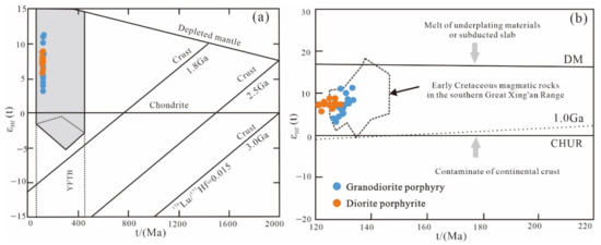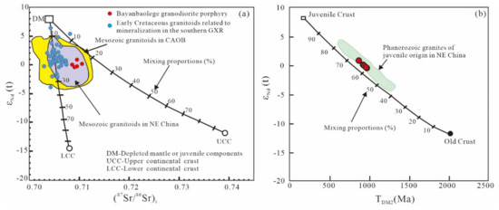 (a) εNd (t) vs. (87Sr/86Sr)i isotopic ratio plot showing mixing proportions between two end members (modified after [29]). The area for Mesozoic granitoids in NE China is from [28,29]); Mesozoic granitoids in CAOB are from [30,31,32]; Early Cretaceous granitoids related to mineralization (data from Table 2); (b) εNd (t) vs. TDM2 diagram [28], and the curve in this diagram approximates the proportions of mixing between juvenile and ancient crustal components. Data for Phanerozoic granites of juvenile origin in NE China are from [28].