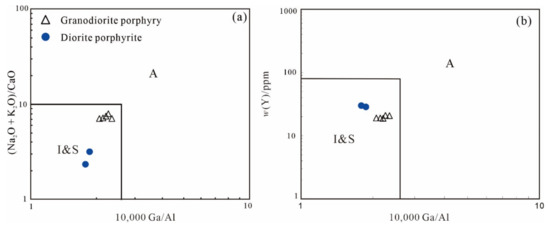 (a) K2O versus SiO2 [25] and (b) A/NK versus A/CNK diagrams [26] for the intrusions associated with the Bayanbaolege deposit.