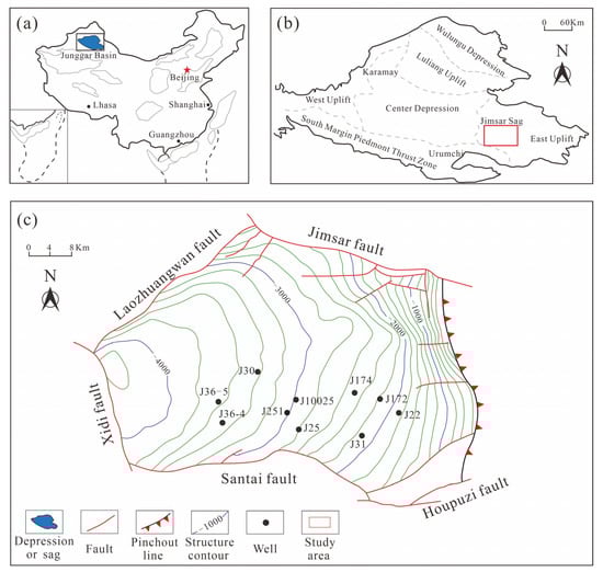(a) Location map of the Junggar Basin in China, (b) location map of the Jimsar Sag in the Junggar Basin, and (c) regional structural map of Lucaogou Formation in the Jimsar Sag [,].