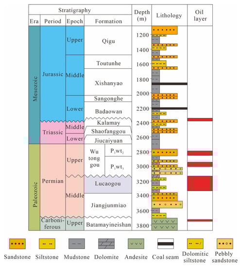 The Jimsar Sag is located in the eastern Junggar Basin, in a tectonic setting which corresponds to the sub-primary depression of the eastern uplift of the Junggar Basin []. It is bounded by the Jimsar Fault to the north and the Santai Fault in the south, with a total area of about 1500 km2 [] (Figure 1). The Jimsar Sag underwent multistage tectonic movements during its formation, mainly during the Hercynian, Indochina, and Yanshan periods [], with the bottom-up development of Carboniferous, Permian, Triassic, and Jurassic strata [,] (Figure 2). The Permian Lucaogou Formation is the main unit for tight oil exploration and development in the Jimsar area. It occurs across the entire depression, with a thickness that generally varies from 200 to 350 m []. The rock types that comprise the Lucaogou Formation are complex, including dolomitic siltstone, mudstone, and dolomite as the dominant lithologic units, with generally fine grain sizes. This makes it a typical tight oil reservoir, with good prospects for exploration and development.