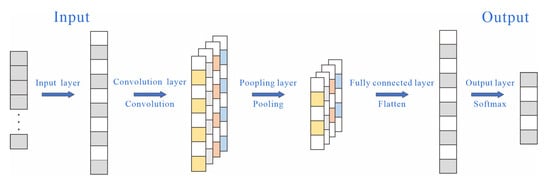CNN is a deep feedforward neural network. Compared with the traditional neural network model, the increase in feature extractors in the combination of the convolutional layer and pooling layer effectively reduces the parameters of the neural network, and solves the problem of having too many model parameters and too much training time when the number of hidden layers is too large []. The basic structure of a convolutional neural network includes the input layer, the convolutional layer, the pooling layer, the fully connected layer, and the output layer (Figure 3). Commonly, a 1D-CNN is used in the fields of sequence modeling and natural language processing; a 2D-CNN is commonly used in the fields of computer vision and image processing; and a 3D-CNN adds a temporal dimension, which can extract temporal and spatial features at the same time, and is often used in CT imaging, behavior recognition, video processing, etc. []. The problem studied in this paper belongs to the sequence model; therefore, the 1D-CNN method was used (Figure 3). In the most common convolutional neural networks, the convolutional layer and pooling layer alternately set up connections. Each neuron in each feature plane in the convolutional layer is locally connected to the input data of the previous layer, and the input data is folded with the convolutional kernel plus the bias value; thus, such a neural network is named a convolutional neural network.